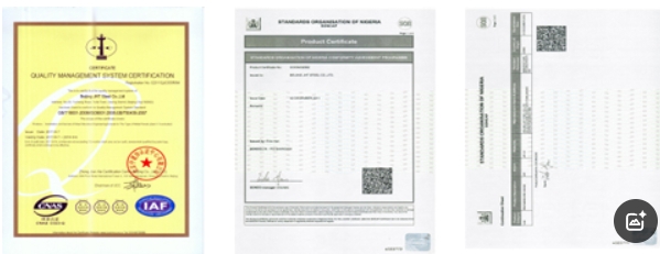Approval certificates carrying ISO9001/2000, ISO14001, and CE accreditation,etc often required by different clients are presented to the local Custom or government.